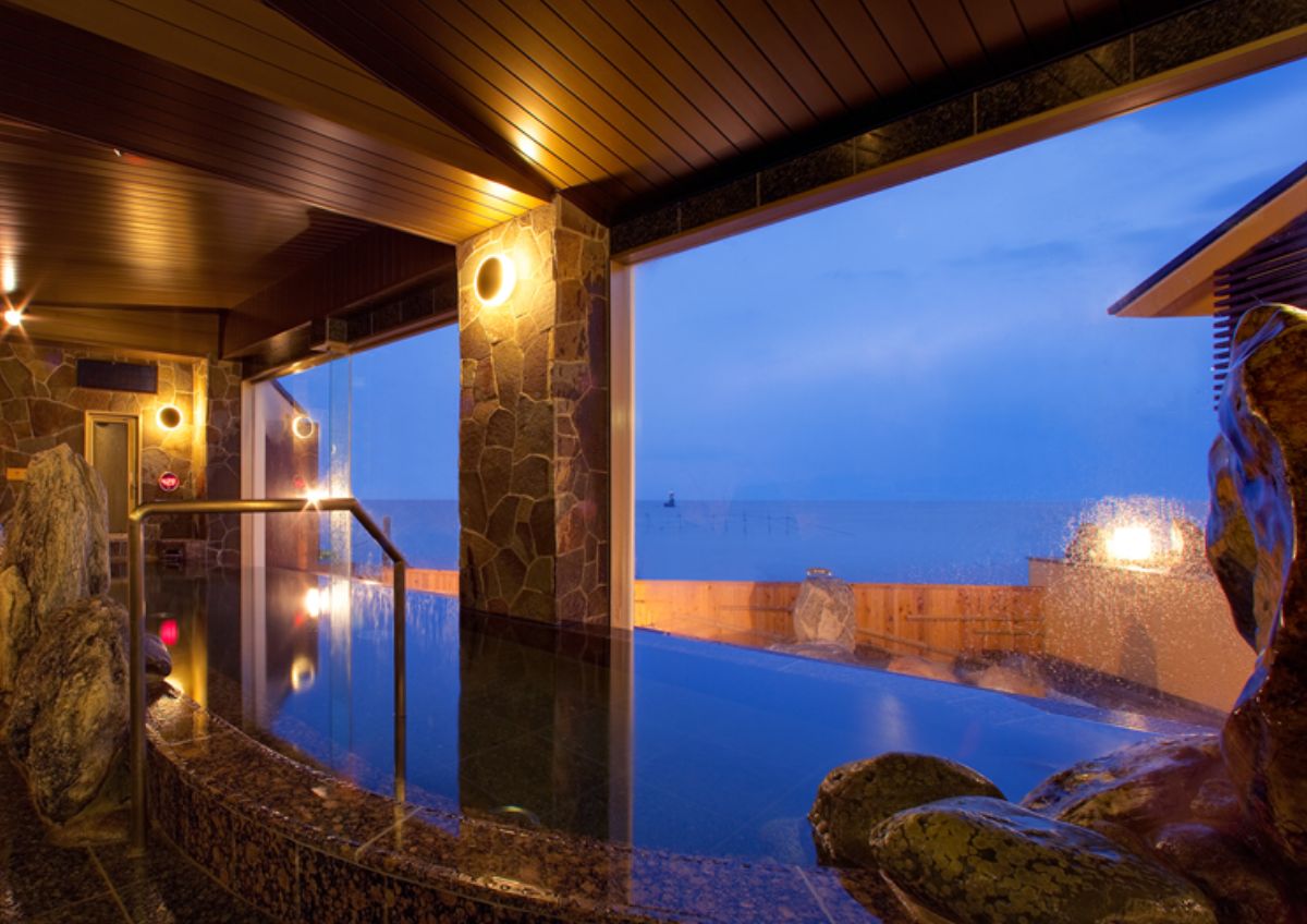 自然の岩壁を利用したダイナミックな内湯と海に向かうオープンエアな露天風呂。サウナでは約20分に1回、熱した石の上に水を垂らし、水蒸気を発生させるボナパーム式サウナを採用。(天海の湯も同様)。肌にやさしく、適度な蒸気が全身を温かく包み、女性やお年寄りでも安心の発汗浴法です。