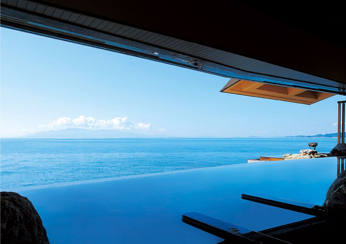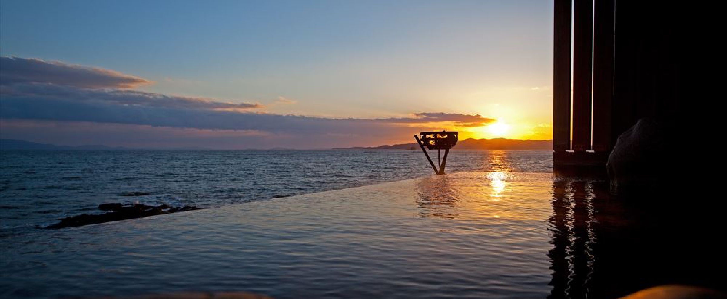 広大な海の景色に出会う絶景露天風呂の宿。海と溶け込むように作られた湯船から見る景色は圧巻の一言。瀬戸内海の大パノラマが目の前に広がります。日常を忘れ、幻想的なひとときをお過ごしください